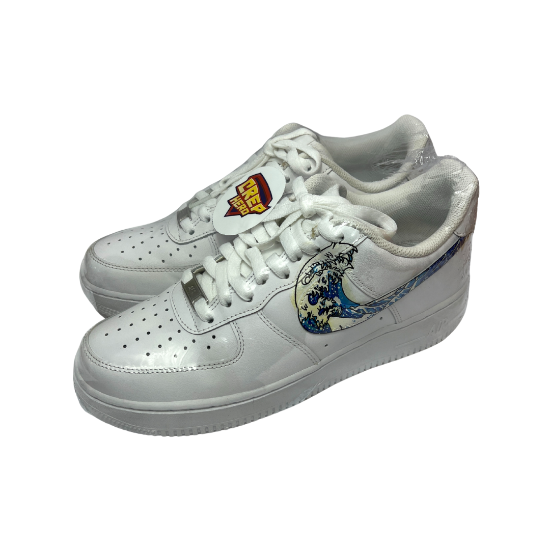 This classic pair of Nike Air Force 1 '07s features a unique twist, a custom hand-painted acrylic wave design on the leather Swoosh, making them truly one-of-a-kind. Worn only once, they show no noticeable marks or stains, have no bad odours, and have undergone a full professional deep clean. Comes with the original box and is in excellent near-new condition, perfect for collectors or anyone looking for a fresh, standout pair.
